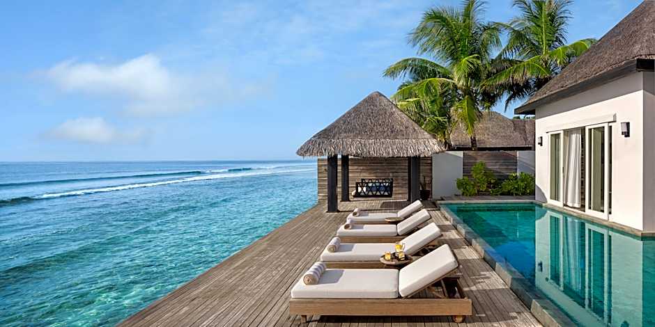 This spacious, ocean facing villa villa features a private pool, outdoor dining terrace, sun deck, dining pavilion and sala. The butler’s kitchen and well stocked pantry nestle behind an elegant open plan dining and living room. Upstairs, the master suite features a dressing room, king bedroom, lounge and daybed balcony overlooking the ocean, and a lagoon view bathroom with rain shower and bathtub, Downstairs, the twin bedroom leads to a dressing room and indoor-outdoor bathroom.